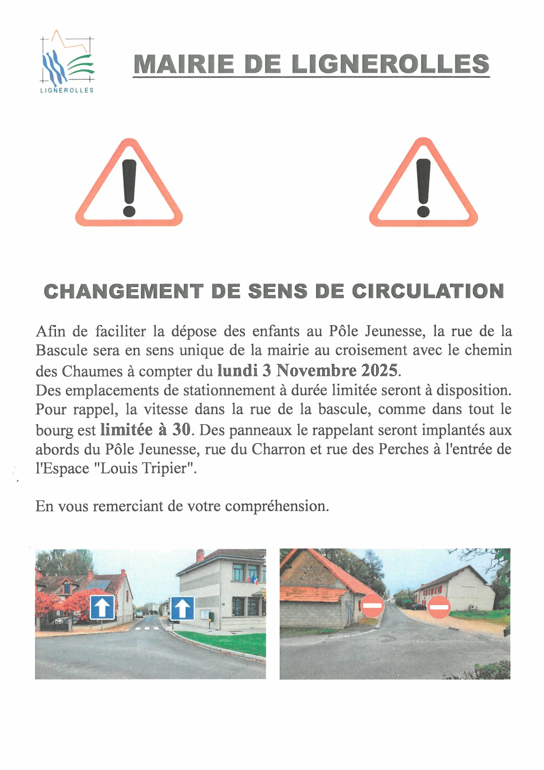 Rue de la Bascule – La circulation sera en sens unique de la mairie au croisement avec le chemin des Chaumes, afin de faciliter la dépose des enfants au Pôle Jeunesse.