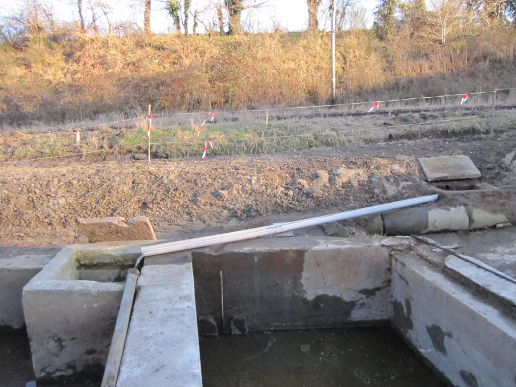 L’endroit est très humide. Il devient urgent de drainer au maximum. Nous remettons donc en service le petit canal qui provient de la fontaine et qui passe derrière le lavoir, puis nous découvrons tout un système d’arrivée et d’évacuation d’eau. Avec une tringle en fer et beaucoup de persévérance, nous réussissons à déboucher les buses et les regards.
