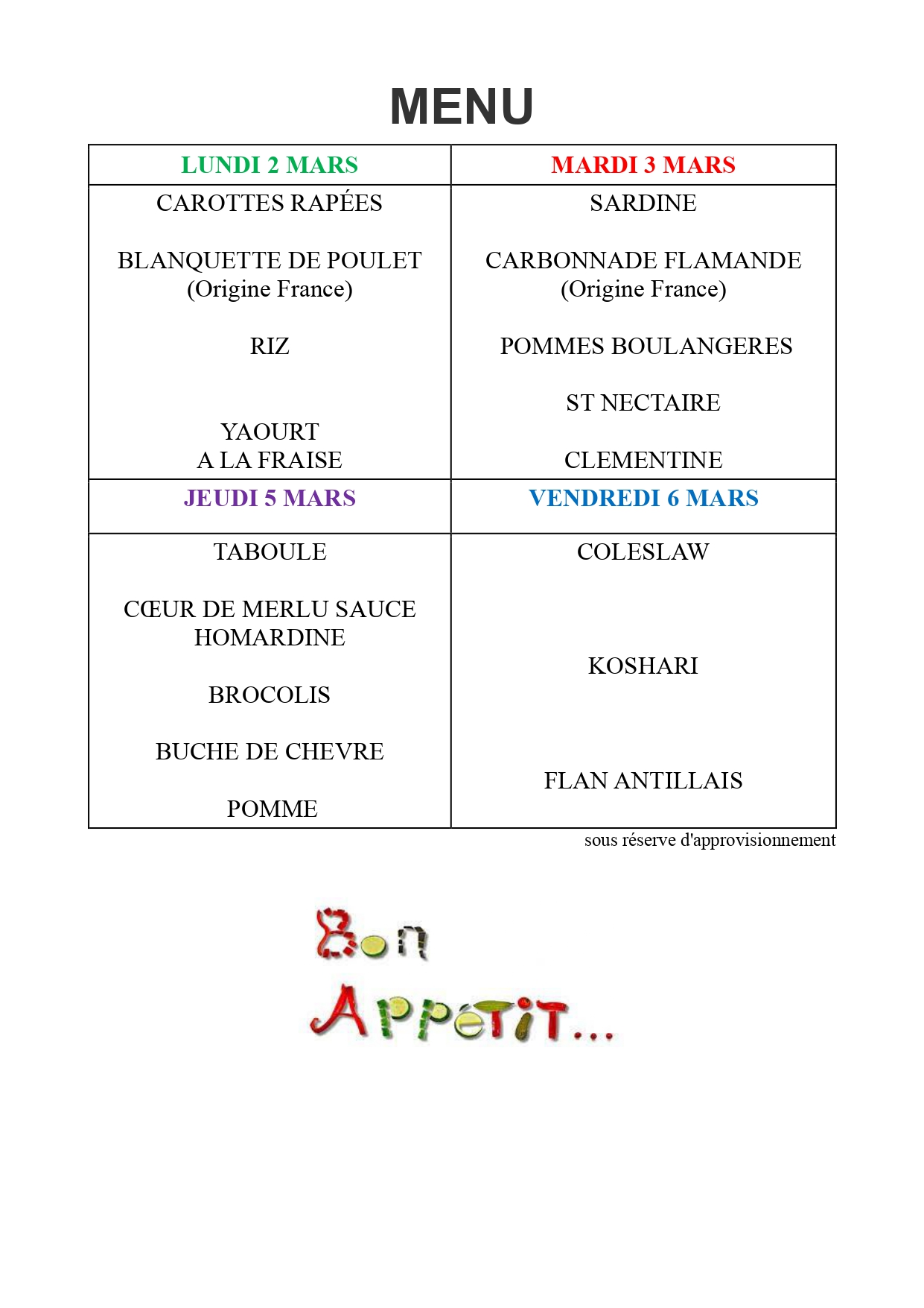Les menus sont mis en ligne ici toutes les semaines.